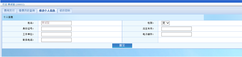 成功登录系统后点击 “修改个人信息”功能菜单,进入个人信息界面如图3-1修改相关信息后,点击 “提交” 按钮,成功后完成个人信息修改。
